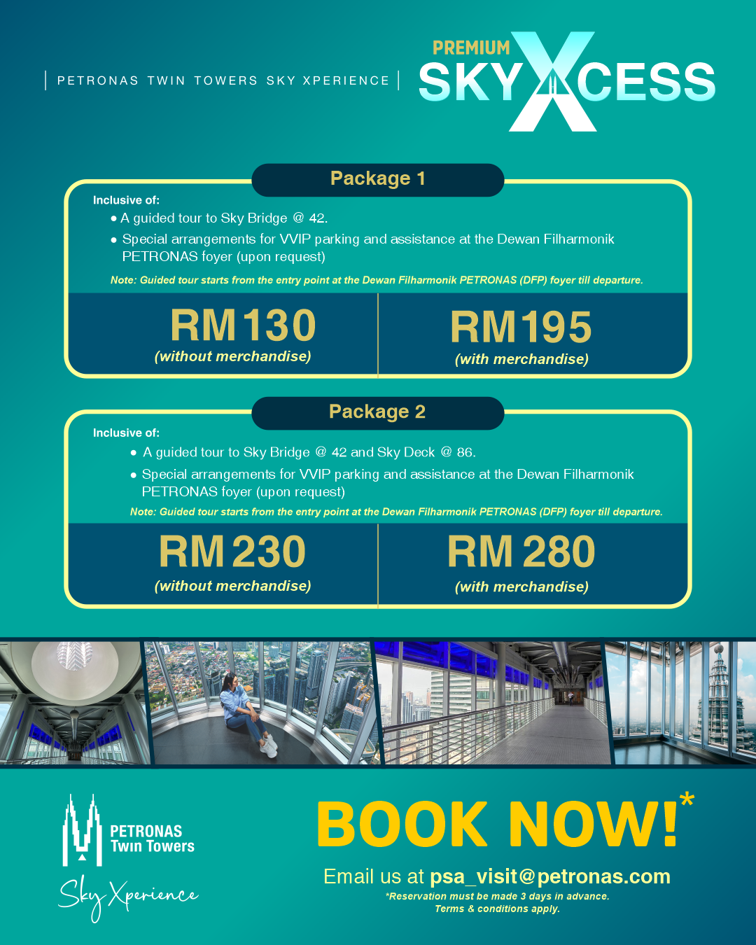 - The PETRONAS Twin Towers Visit Operation Premium Sky Access Package is available for purchase exclusively through the PETRONAS Twin Towers email psa_visit@petronas.com platform. Tickets under this package will not be sold at physical counters or on any other platforms.